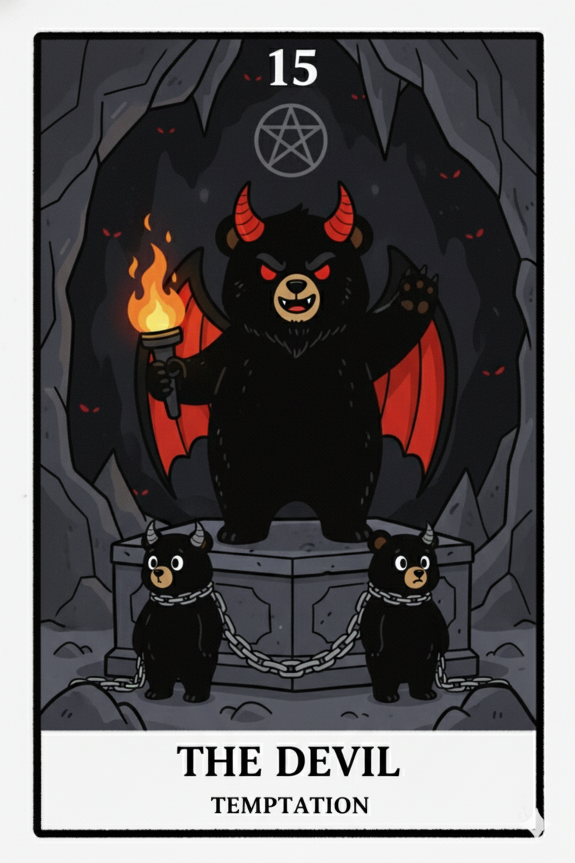 악마 카드는 삶에서 속박, 집착, 과도한 욕망을 상징하는 카드입니다.